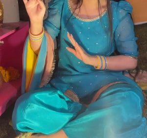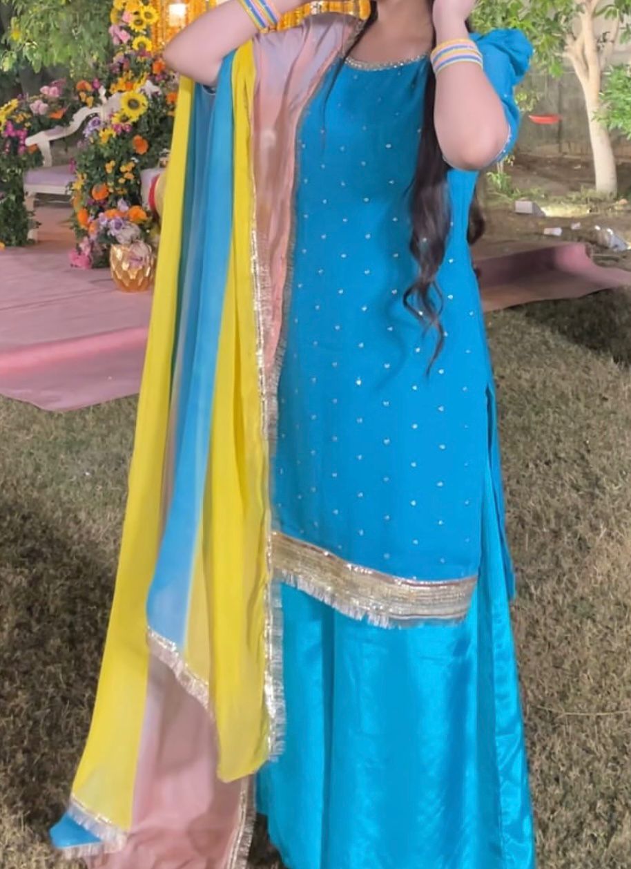 Feature Description Color Type Sky Blue Lining Attached As shown in the picture Number of Articles 3-Piece Set (Shirt + Dupatta + Bottom) Shirt Fabric Georgette Chiffon Trouser Fabric Silk Dupatta Fabric Georgette Chiffon Shirt Style Short Shirt Bottom Style Plazo For color customization or size adjustments, feel free to DM us — we’ll tailor it just for you! ✨