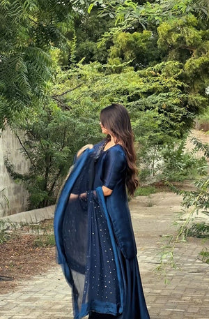 Feature Description Color Type Navy Blue Lining Attached As shown in the picture Number of Articles 3-Piece Set (Shirt + Bottom + Dupatta) Shirt Fabric Pure Silk Trouser Fabric Pure Silk Dupatta Fabric Georgette Chiffon Shirt Style Long Shirt Bottom Style Plazo For color customization or size adjustments, feel free to DM us — your perfect outfit awaits! ✨